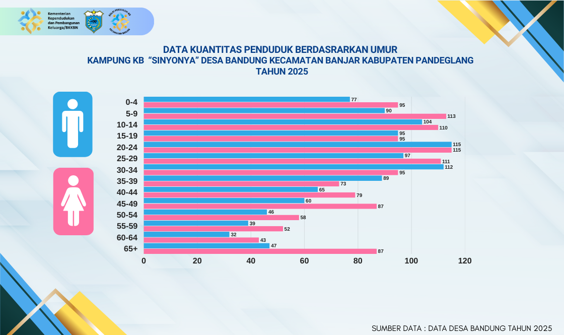 Struktur umur penduduk Desa Bandung, Kampung KB "Sinyonya", menunjukkan komposisi yang dinamis dan berfokus pada usia produktif. Data ini menjadi panduan penting bagi implementasi program keluarga berkualitas (Kampung KB), seperti yang digambarkan pada grafik dibawah: