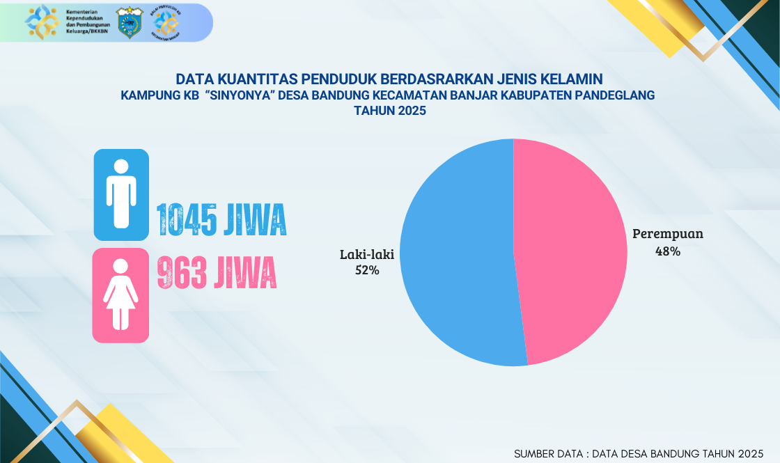 Dengan rasio yang hampir seimbang ini, Kampung KB "Sinyonya" memiliki fondasi demografi yang ideal untuk mengimplementasikan program pembangunan keluarga yang terencana, sehat, dan mandiri.