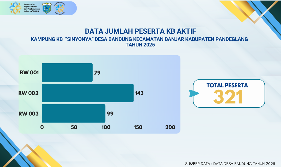 Total keseluruhan Peserta KB Aktif di Desa Bandung berjumlah 321 pasangan. Angka ini mencerminkan komitmen pasangan usia subur (PUS) dalam merencanakan keluarga. Distribusi peserta aktif di tiga Rukun Warga (RW) menunjukkan sebaran partisipasi: