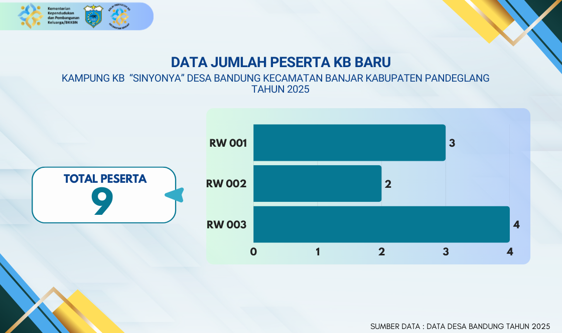 Total keseluruhan Peserta KB Baru di Desa Bandung pada tahun 2025 adalah 9 pasangan. Angka ini menunjukkan adanya penambahan sasaran program dalam upaya mempertahankan dan meningkatkan cakupan KB aktif. Distribusi peserta baru di tiga Rukun Warga (RW) adalah sebagai berikut: